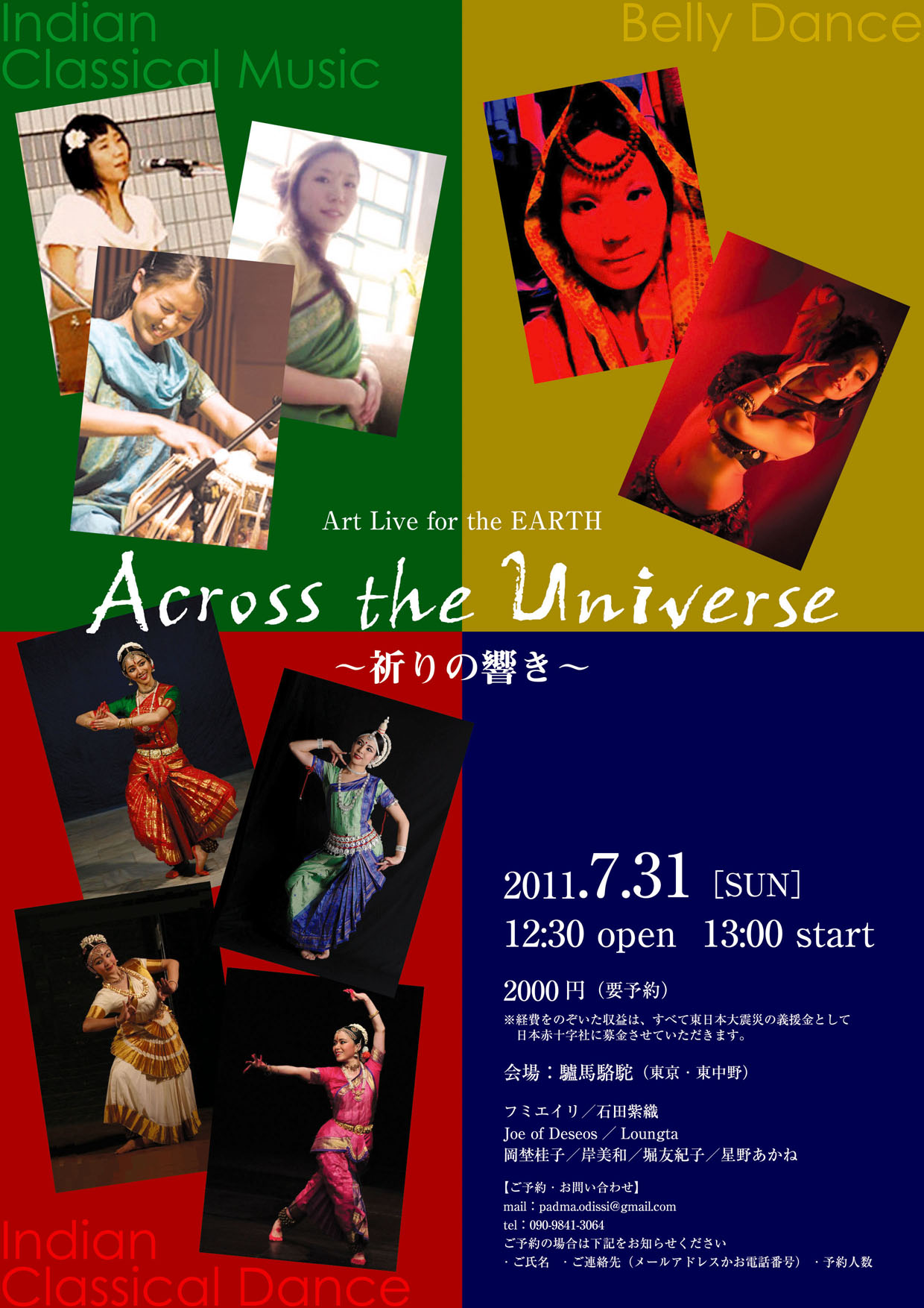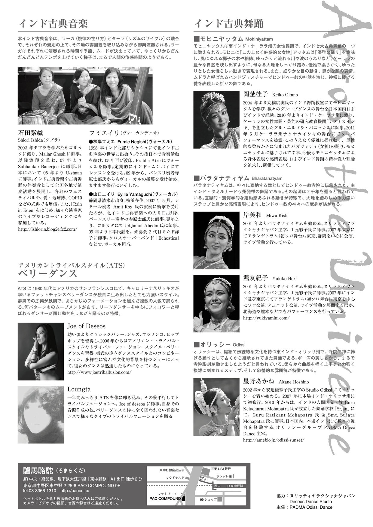 | 出演 | ◇ インド古典音楽 フミエイリ [根岸フミエ & 山口エイリ](ヴォーカルデュオ) ◇ ベリーダンス(アメリカントライバルスタイル) Joe of Deseos http://www.joetribalfusion.com ◇ インド古典舞踊 岡埜桂子(南インドケーララの古典舞踊モヒニヤッタム) |