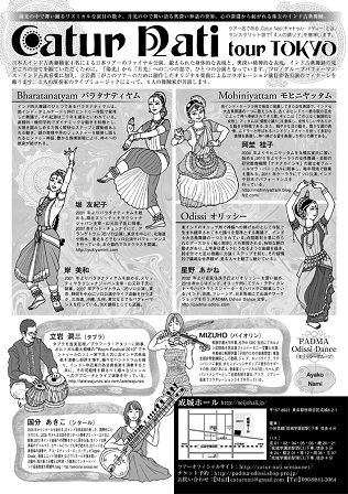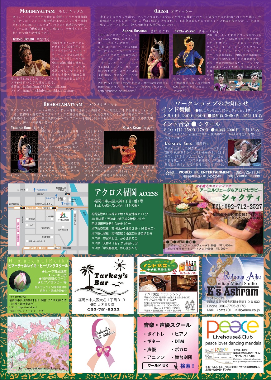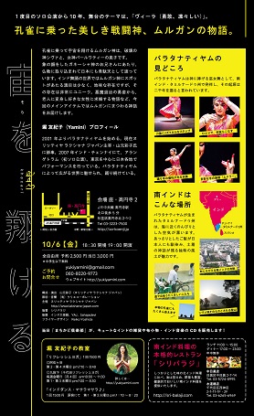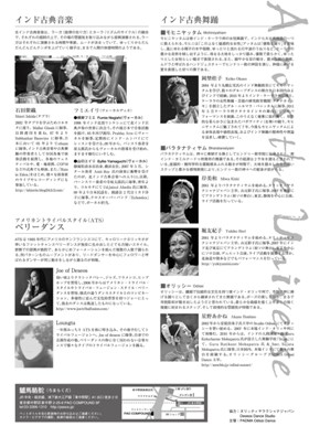 出演 | 岡埜桂子(モヒニヤッタム) 岸美和(バラタナティヤム) 星野あかね(オリッシー) 堀友紀子(バラタナティヤム) PADMA Odissi Dance (オリッシーグループ) ◆スペシャルゲスト 立岩潤三(タブラ) 国分あきこ(シタール) MIZUHO(バイオリン) |