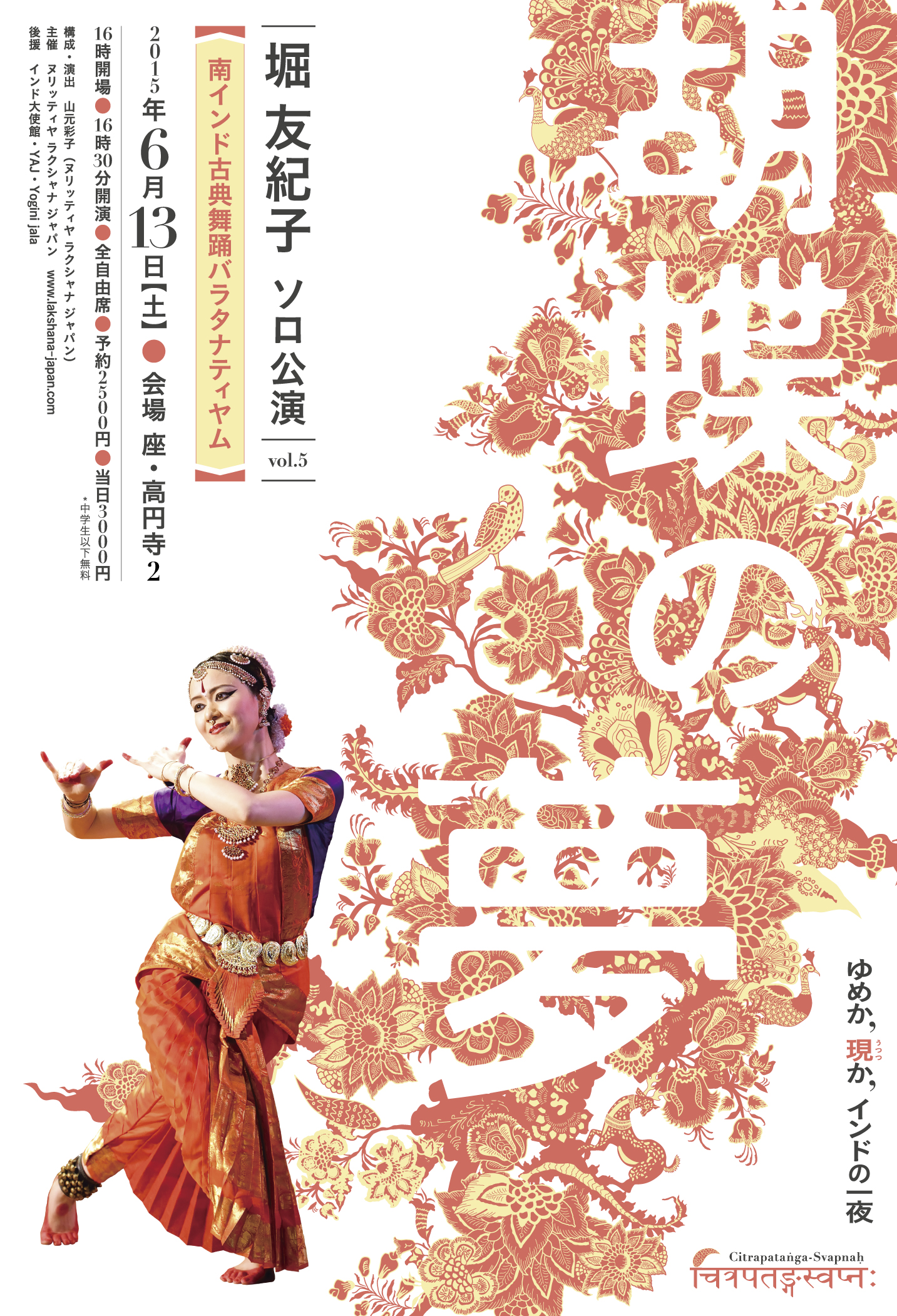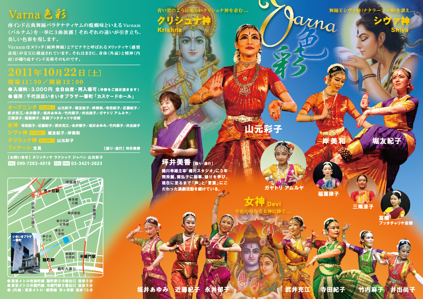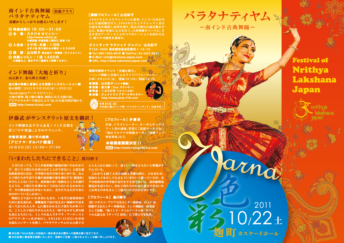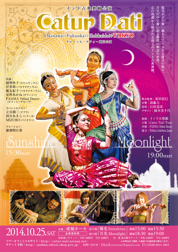 出演 | ◇ インド古典舞踊 サキーナ彩子・SACHIE・吉田真理・荒木絵美 Catur Nati(岡埜桂子・岸美和・星野あかね・堀友紀子) ◇ インド古典音楽シタール演奏 相場勝也 ◇ クリスタルボール演奏とマントラ 山本香苗・黒木優子 |