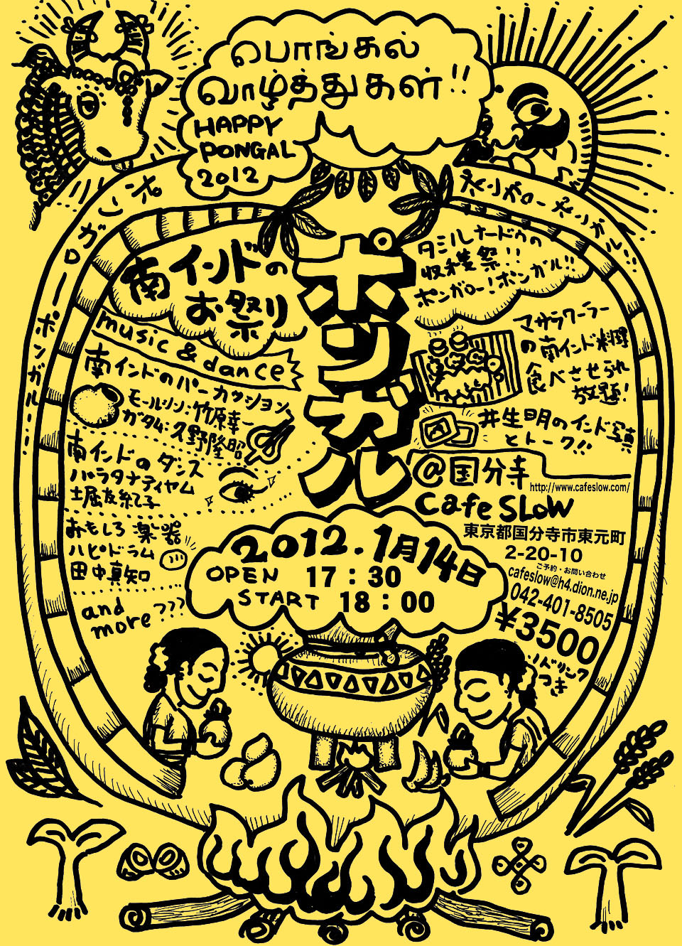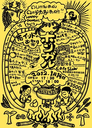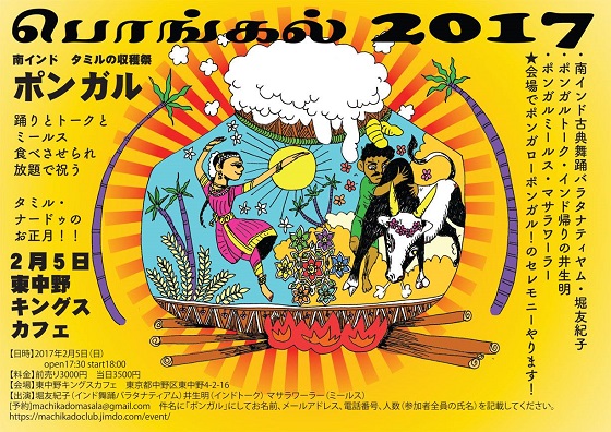 ・マサラワーラーの南インド料理 ポンガルスペシャルミールス!! 食べさせられ放題!! ・井生明のインド写真展示とトーク ・まちかどクラブのインド雑貨、カルナーティックCD販売 ・南インドの口琴『モールシン』:竹原幸一 ・壷の打楽器『ガタム』:久野隆昭 ・新しい楽器『ハピドラム』:田中真知 ・南インド古典舞踊『バラタナティヤム』:堀友紀子 and more....??? |