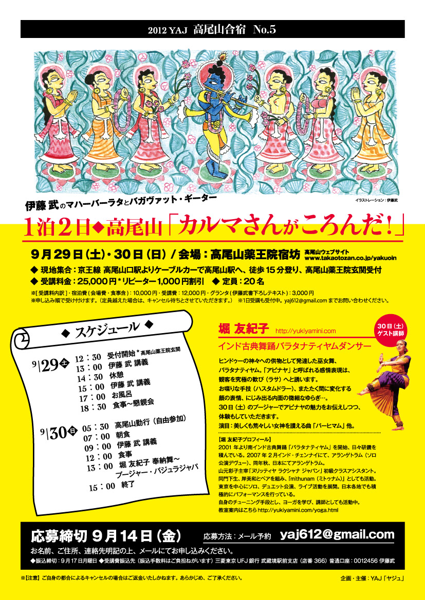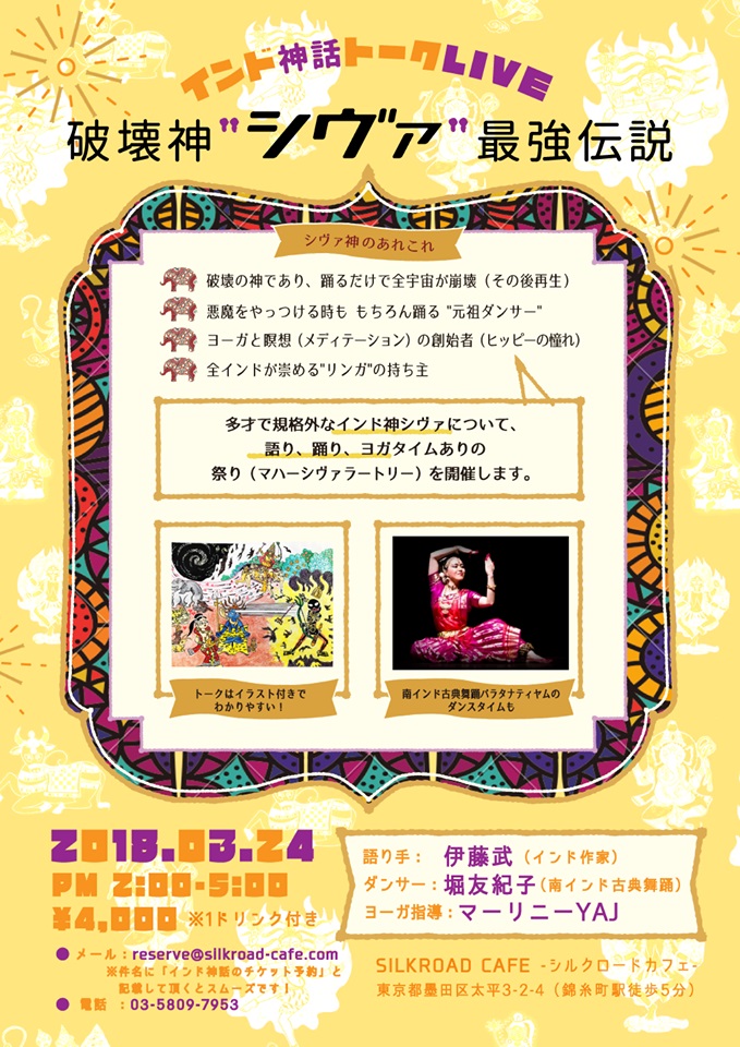 ・語り手:伊藤武(作家) ・ヨーガ指導:マーリニー(YAJヨーガ指導者) ・南インド古典舞踊バラタナティヤム:堀友紀子 |