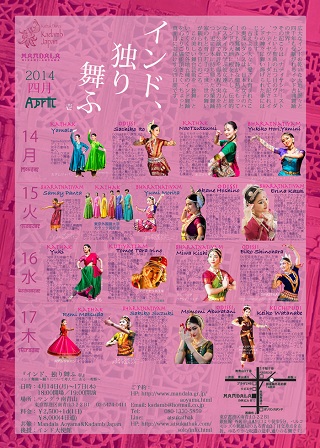 | 料金 | 1 day=2,500円(+1D) 4 days Pass=8,000円 | 出演 | ◇ 4/14(月) Yamala(Kathak) 伊藤祥子 (Odissi) 堤菜穂(Kathak) 堀友紀子 (Bharatnatiyam) ◇ 4/15(火) Samay Panta(Bharatnatiyam) 東京外国語大学カタックサークル(Kathak) 森田裕美(Bharatnatiyam) 星野あかね(Odissi) 葛西恵理奈(Bhratnatiyam) ◇ 4/16(水) ユキ(Kathak) 入野智江ターラ(Kutiyattam) 岸美和(Bharatnatiyam) 篠原英子(Odissi) ◇ 4/17(木) 松田レミ(Kathak) 鈴木咲子(Bharatnatiyam) 油谷百美(Odissi) 渡辺桂子(Kuchipdhi) |