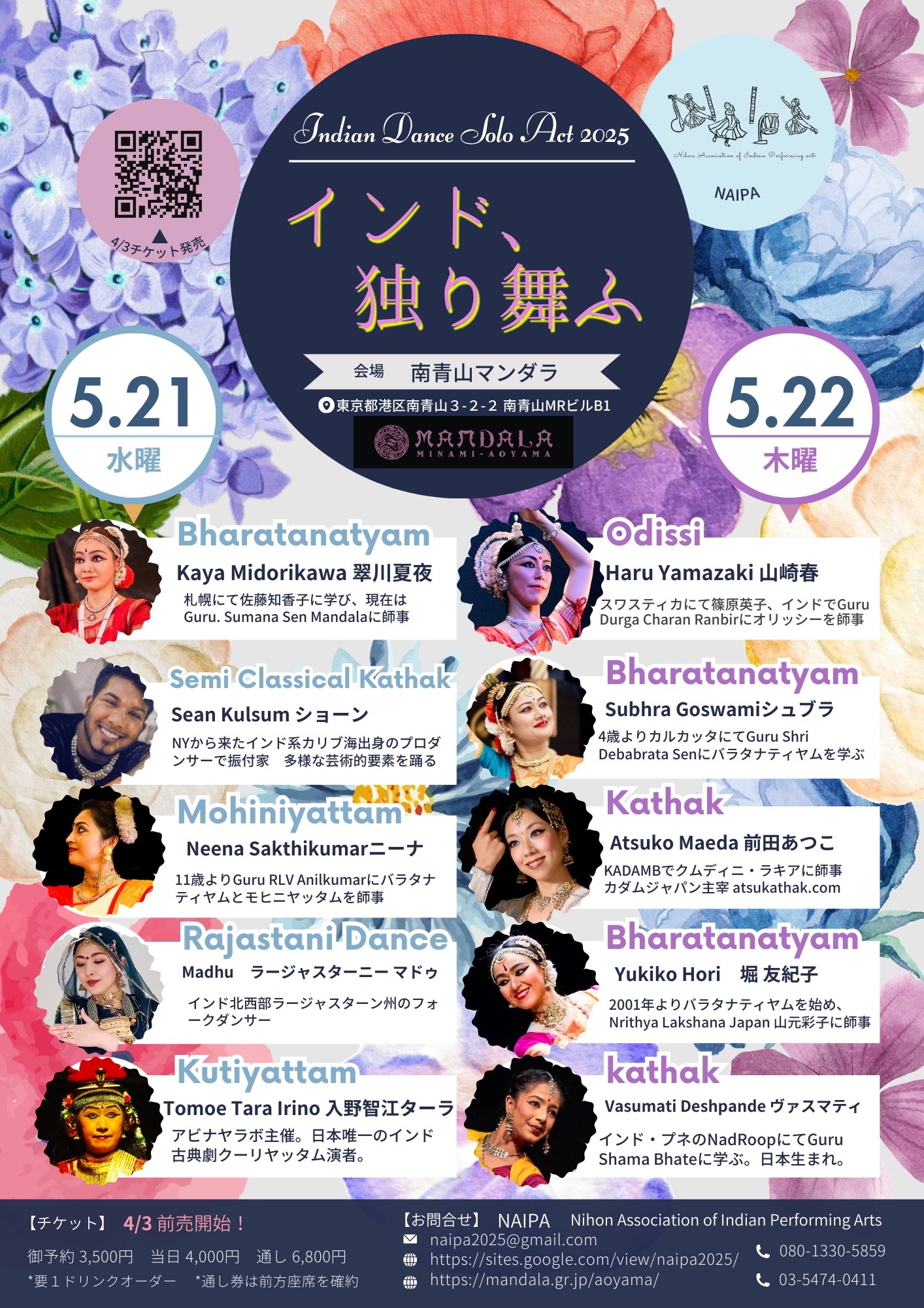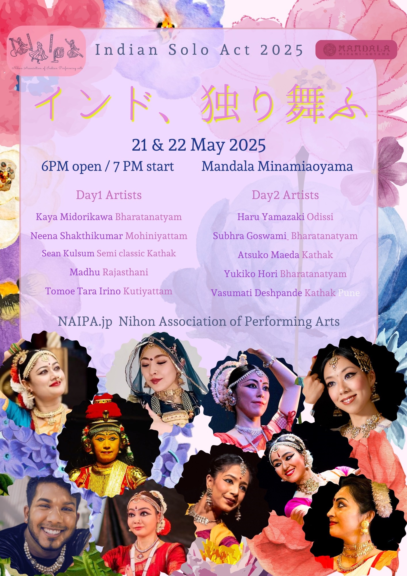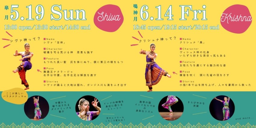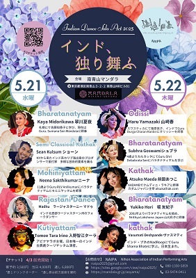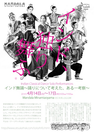出演 | ◇ 5/21(水) Bharatantyam: Kaya Midorikawa 翠川夏夜 Semi Classical Kathak: Sean Kulsum ショーン Mohiniyattam:Neena Sakthikumarニーナ Rajastani Dance: Madhu ラージャスターニーマドゥ Kutiyattam:Tomoe Tara Irino 入野智江ターラ ◇ 5/22(木) Odissi: Haru Yamazaki 山崎春 Bharatanatyam: Subhra Goswamiシュブラ Kathak: Atsuko Maeda 前田あつこ Bharatanatyam: Yukiko Hori 堀友紀子 kathak: Vasumati Deshpande ヴァスマティ |